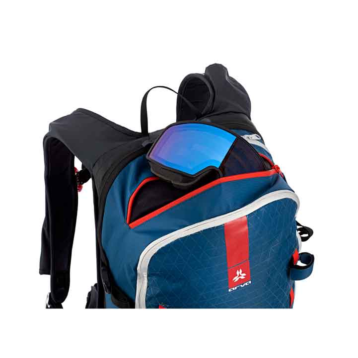Porte casque. Poche équipement de sécurité avalanche (pelle et sonde). Porte piolets. Poche masque/lunettes de soleil.
