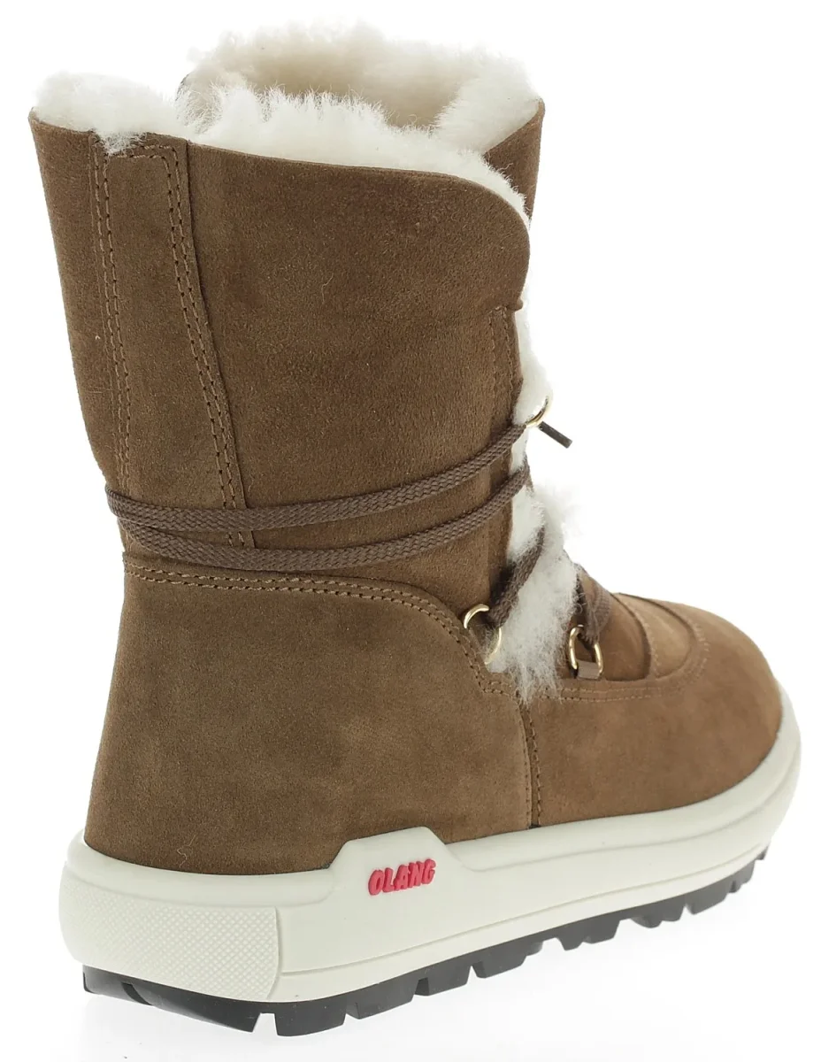 Ces après-ski femme de la marque Olang est en cuir véritable. Fourrées avec de la laine de mouton, ces bottes de neige vous assurent un pied au chaud toute la journée. Ces après-ski en peau retournée sont rendus imperméables grâce à la technologie Olantex. Leurs crampons offrent une bonne adhérence sur les sols glacés.