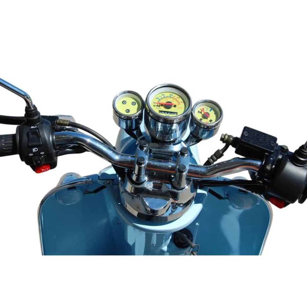 - Style rétro et élégant : Le design rétro et la couleur bleu pastel confèrent au scooter une allure vintage et élégante. Ajoutant une touche de style à vos déplacements urbains.
