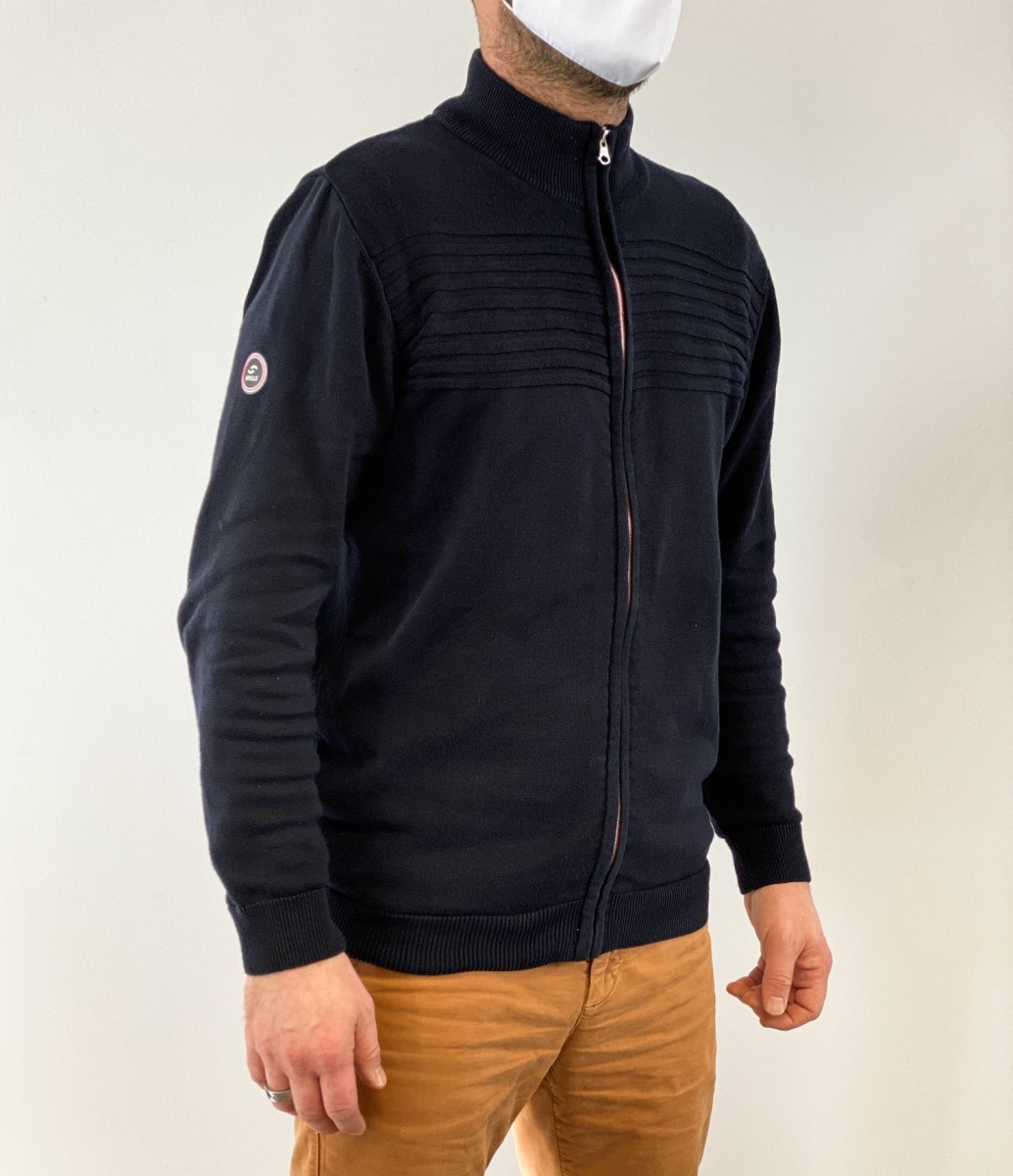 Mélange coton – polyester tricot. Tissu tricoté doux. Coupe relativement ample, col cheminée. Zip intégral métallique et détail fil rouge dans la fermeture zippée. Ecusson silicone bleu-blanc-rouge 3D Skills sur la manche. Bas de vêtement et col effet bord-côte tricoté. Le mannequin mesure 1.83m et porte une taille M. Ce produit taille relativement grand !