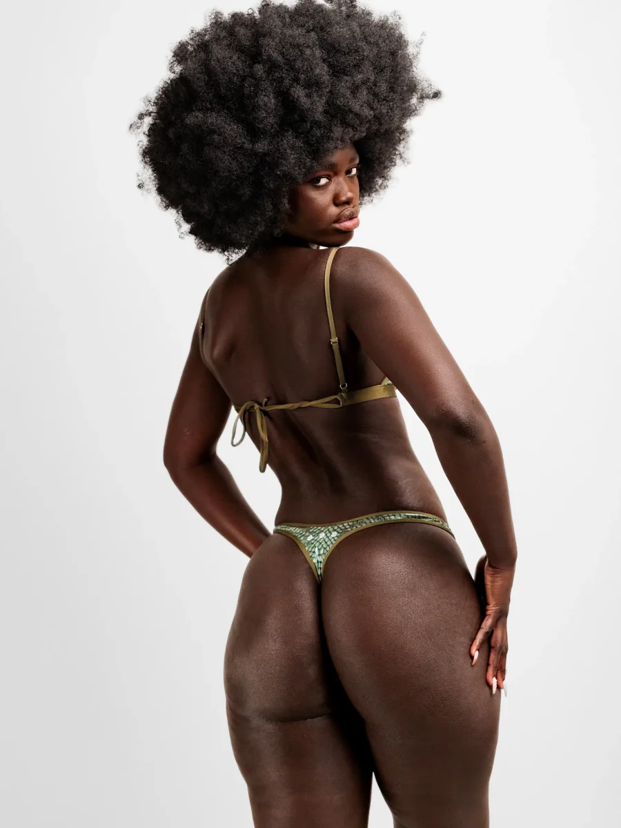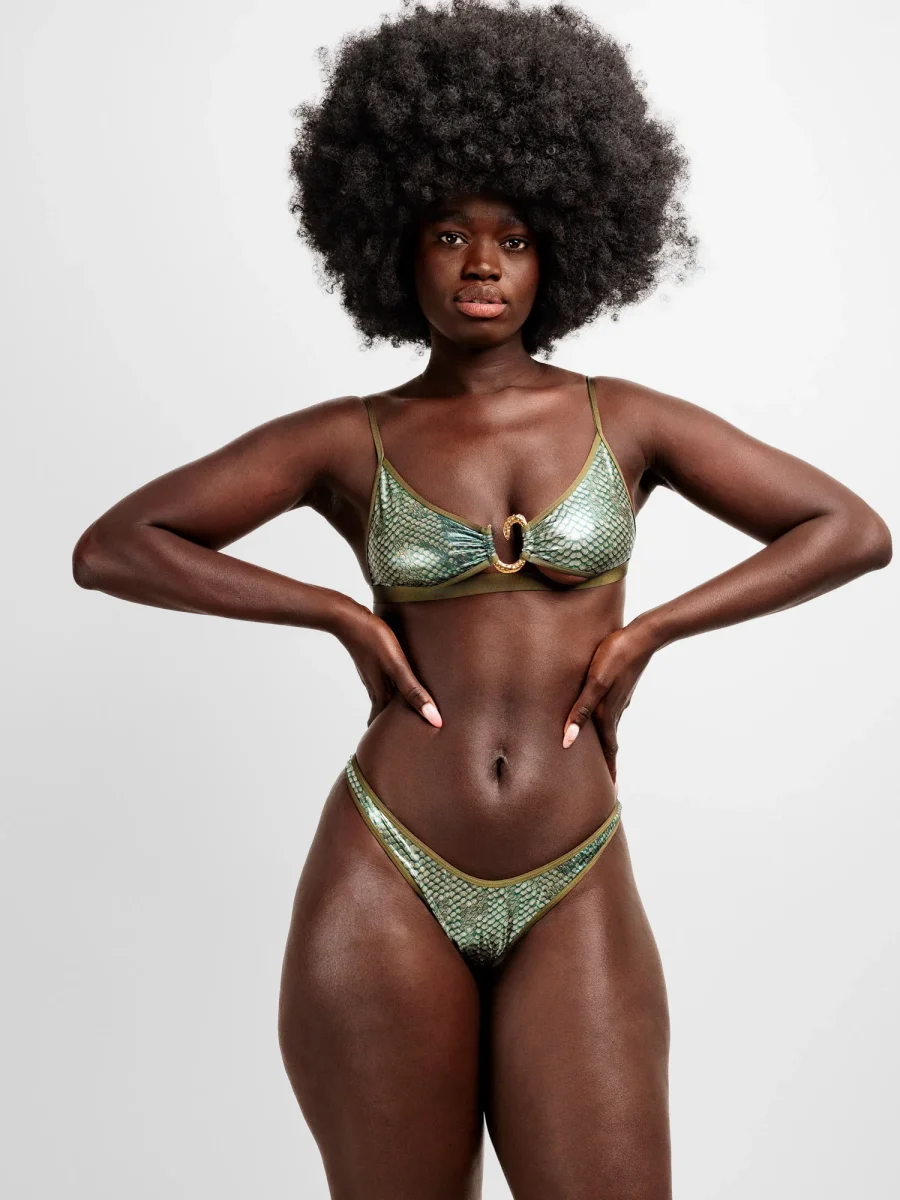 Ce modèle se distingue par son imprimé crocodile sur tissu métallique argenté. Son éclat capte la lumière et sublime votre bronzage.