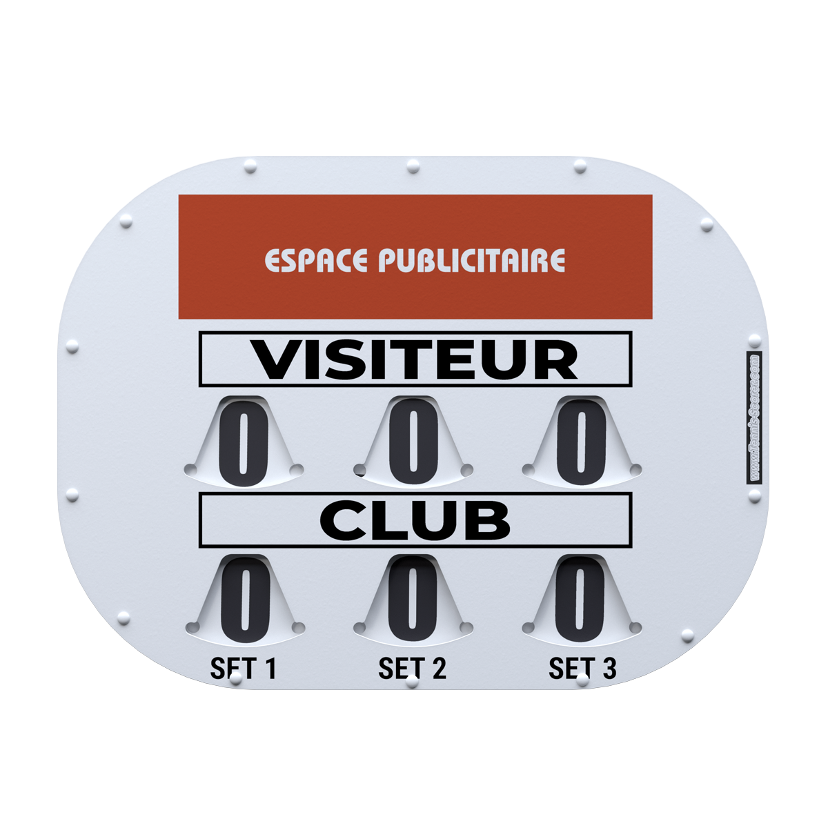 Automatic framing of numbers from 0 to 7, over 3 SETS Material: Unalterable white PVC, All weather è Can stay outside all year round Height of the figures: 12 cms, Width of the figures: 2.5 cms Table readability: + 50 m. Indication of SET numbers. Delivered with: 2 Plates (for manual display of player Names and Rankings) + 1 Advertising sticker of 78×17 cm allowing the possible financing of the table by a sponsoring partner, or the display of the name and logo of the Club, or the number of the Court (or both) 2 YEARS WARRANTY Table dimensions: L.…