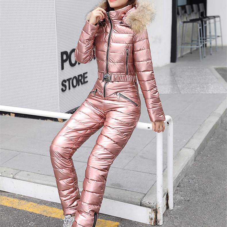 Combinaison de ski femme ajustée avec ceinture et col fourrure