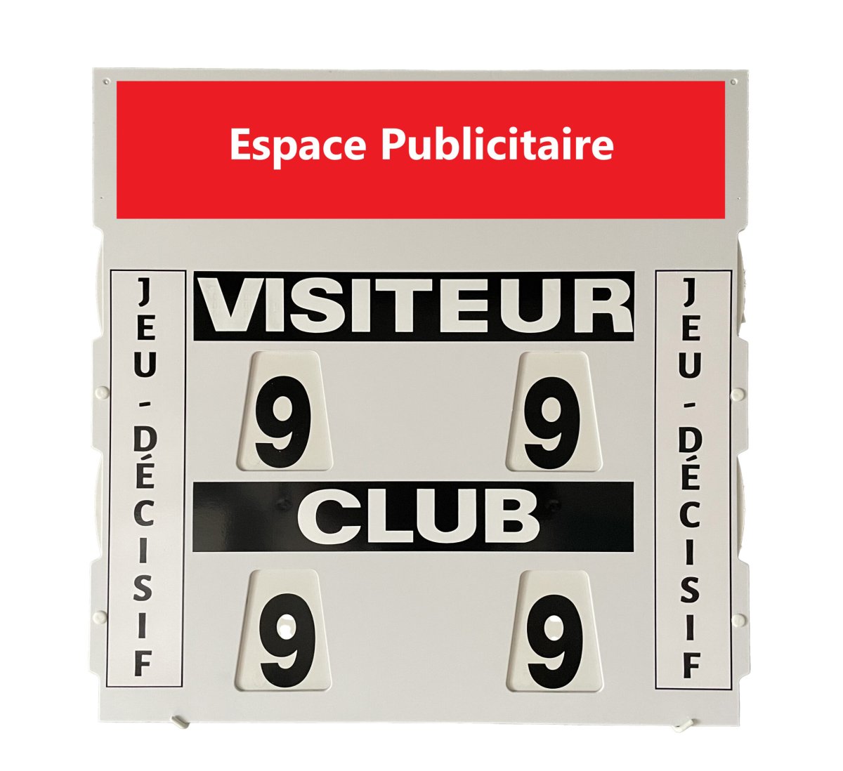 Anzeige von Zahlen von 00 bis 99 für jeden Spieler/jedes Team während entscheidender Spiele. Material: unveränderliches weißes PVC, wetterfest. Höhe der Figuren: 10 cm, Breite: 2 cm Lesbarkeit der Zahlen: + 50 m. Werbefläche: 56×17 cm Geliefert mit: 2 Schildern (zur manuellen Anzeige von Namen und Ranglisten) + 1 Sponsor- oder Club-Werbekleber oder Spielfeldnummer + 4 Serflexs 3 JAHRE GARANTIE Tischabmessungen: L. 60 x H. 60 x th. 1 cm. Gewicht: 2 kg.