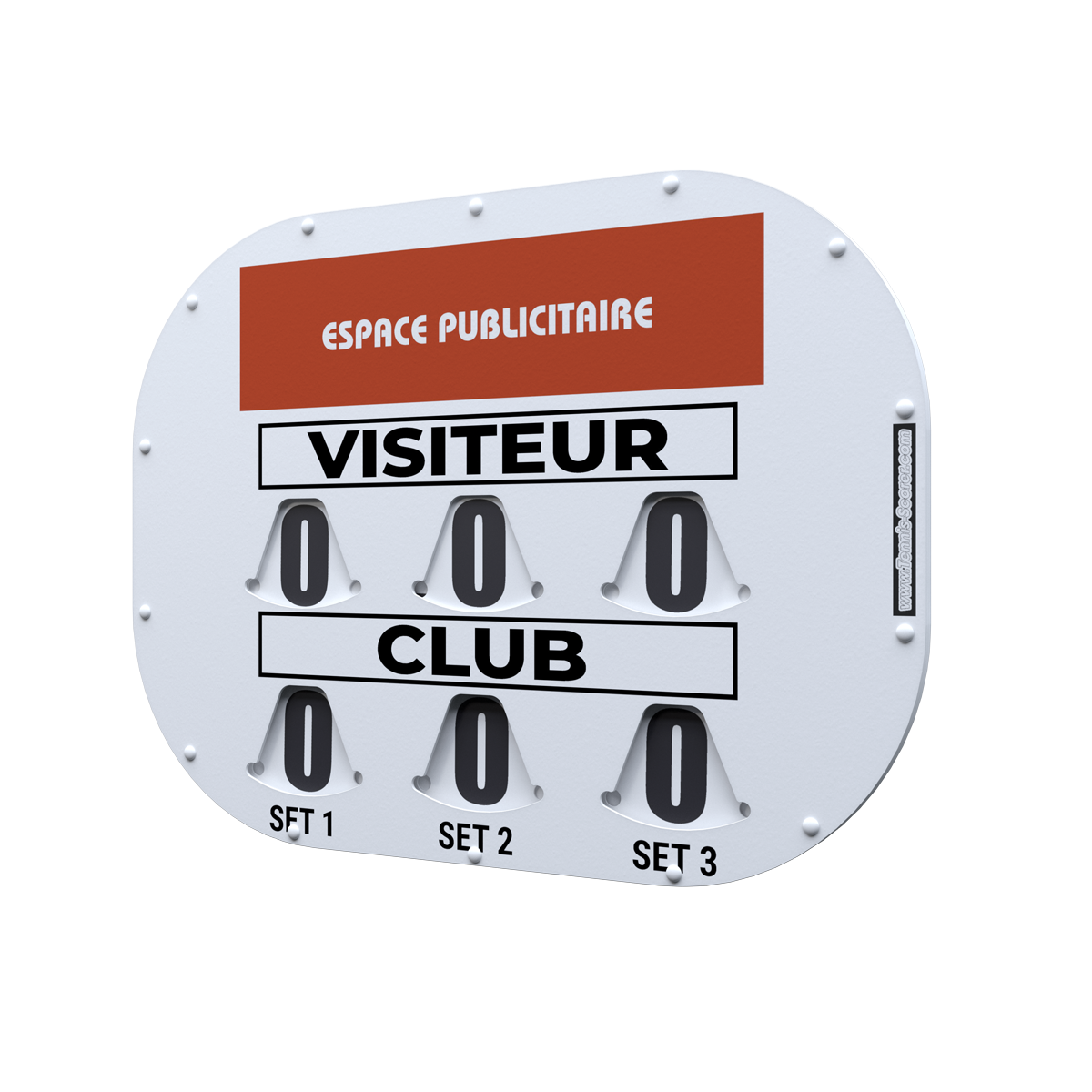 Inquadramento automatico dei numeri da 0 a 7, su 3 SET Materiale: PVC bianco inalterabile, per tutte le stagioni. Altezza dei numeri: 12 cm, Larghezza dei numeri: 2,5 cm. Larghezza dei numeri: 2,5 cm LeggibilitĂ dei numeri: + 50 m. Indicazione dei numeri SET, su entrambi i lati. Spazio pubblicitario: 60×17 cm Fornito con: 4 targhe (per la visualizzazione manuale di nomi e classifiche) + 2 adesivi pubblicitari per sponsor o club o numeri di campo + 4 serflexes GARANZIA DI 2 ANNI Dimensioni del dipinto: L. 80 x h. 60 x ep 0,8 cm Peso: 2,5 kg.