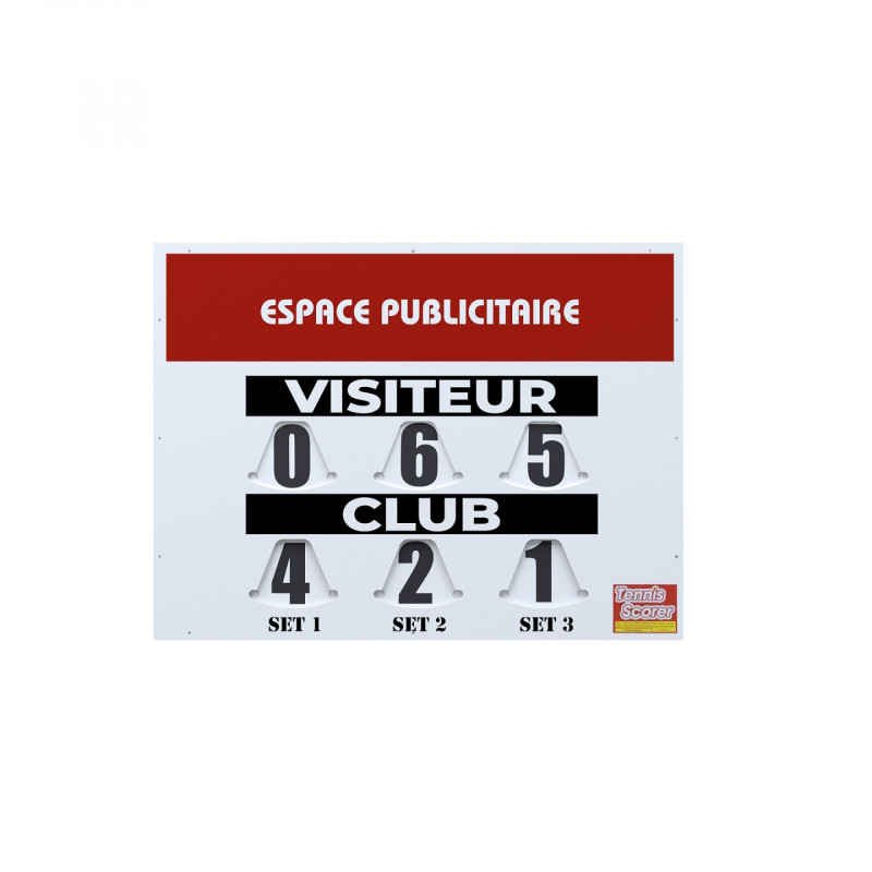 Indicación de números SET - Como todos los marcadores “TENNIS SCORER”, está diseñado con 2 espacios publicitarios de 78 x 17 cm que pueden ser ocupados por el logo de un anunciante/financiero o por el logo del club, o por un adhesivo N° de CANCHA, esto permite Promocionar las canchas, el club y el patrocinador. Esto también permite equipar el Club de forma sostenible y sin coste alguno si se encuentra un socio.