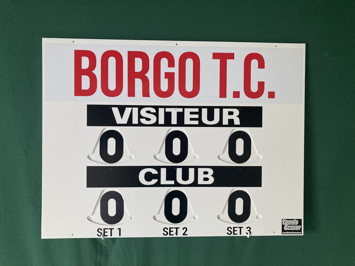 Encuadre automático de números del 0 al 7, en 3 JUEGOS Material: PVC blanco inalterable, Todo clima è Puede permanecer afuera todo el año Alto de las figuras: 12 cm, Ancho de las figuras: 2,5 cms Legibilidad de la mesa: +50 m. Indicación de números SET. Se entrega con: 2 Placas (para visualización manual de Nombres y Rankings de jugadores) + 1 Adhesivo publicitario de 78×17 cm que permite la posible financiación de la mesa por parte de un socio patrocinador, o la visualización del nombre y logo del Club, o el número de tribunal (o 2) 5 AÑOS DE…
