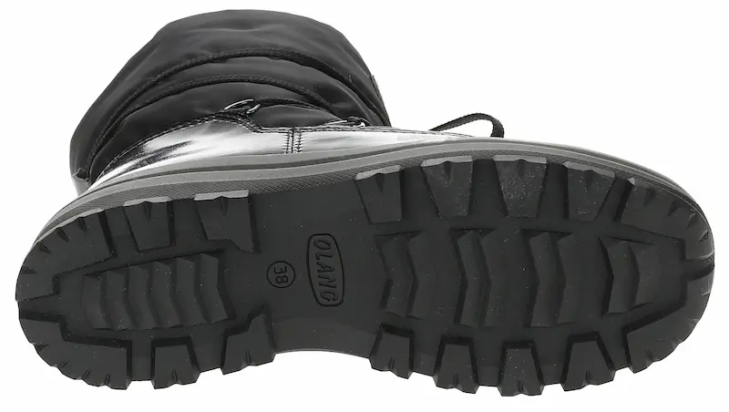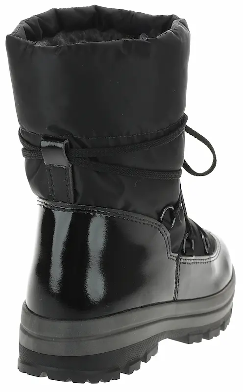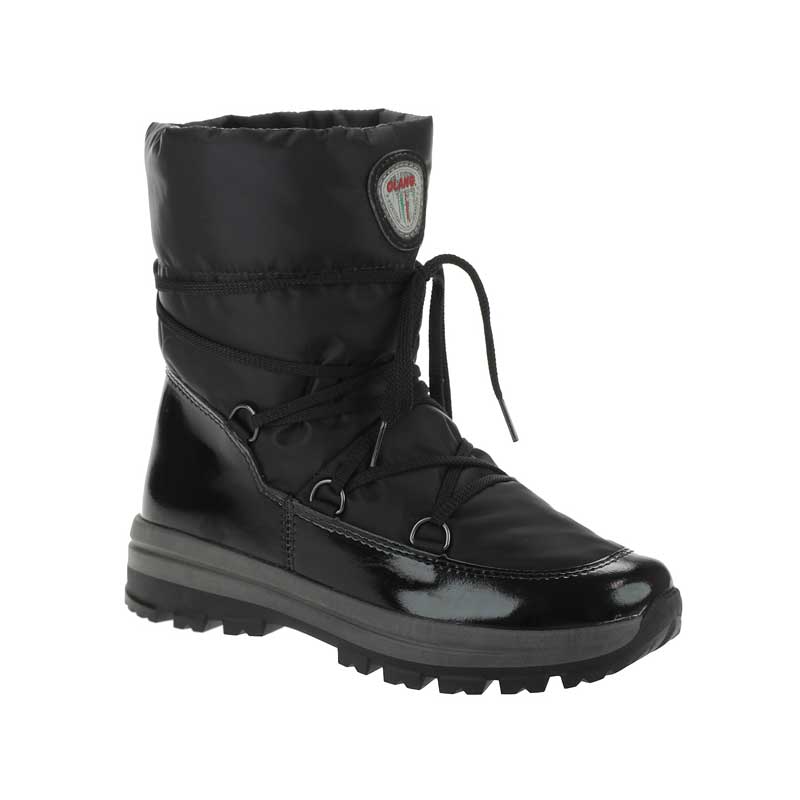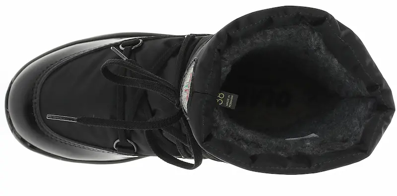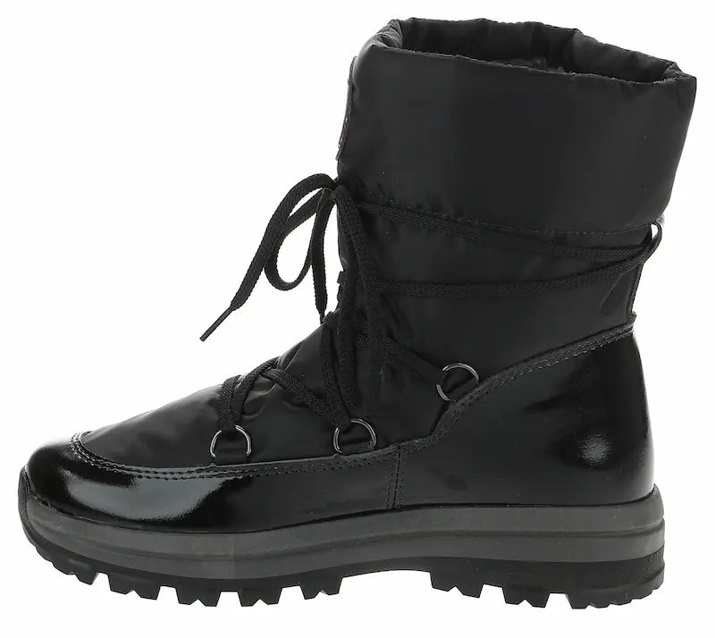 Après-ski mi-hauteur, noir et noir verni, équipés d’une membrane Olantex (respirante et résistante à l’eau).