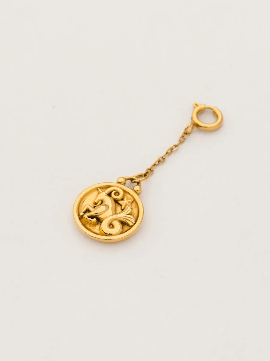 Ce pendentif doré, conçu pour être porté sur un maillot de bain, est une nouveauté alliant style et astrologie. Il représente le Capricorne d’un coté et sa constellation de l’autre.