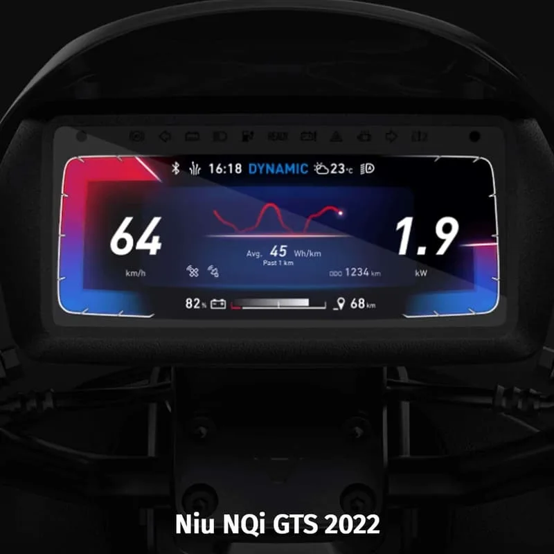 Le Niu NQi GTS dispose d’un écran de bord digital et dynamique. Cet écran est une référence : sur le marché, en 2023, il n’est pas possible de trouver mieux. On y trouve les classiques : vitesse instantanée, autonomie restant des batteries, clignotants, odomètre, etc. Mais aussi, l’heure, la température extérieure, la consommation moyenne.