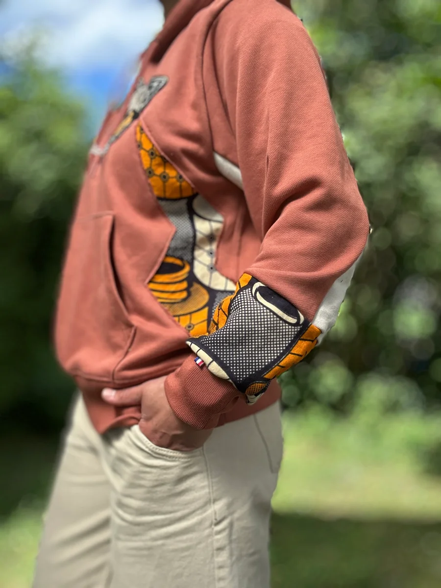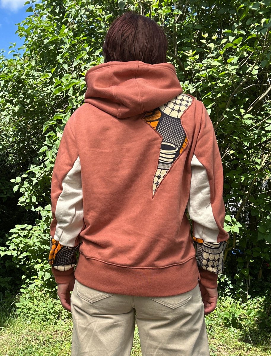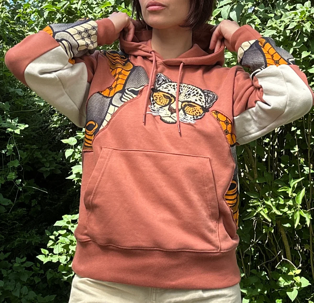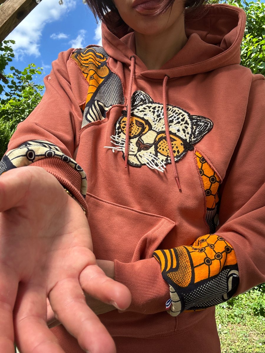 Du tigre et de la Wax !! Modèle unique, création fait main à Fontainebleau dans le 77. Sweat à capuche, Unisex, avec une poche kangourou à l’avant. Tous nos pulld sont larges ou over size