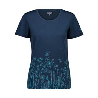 T-shirt Femme, de la marque italienne CMP, avec un imprimé différent selon la couleur choisie : bleu marine ou jaune.