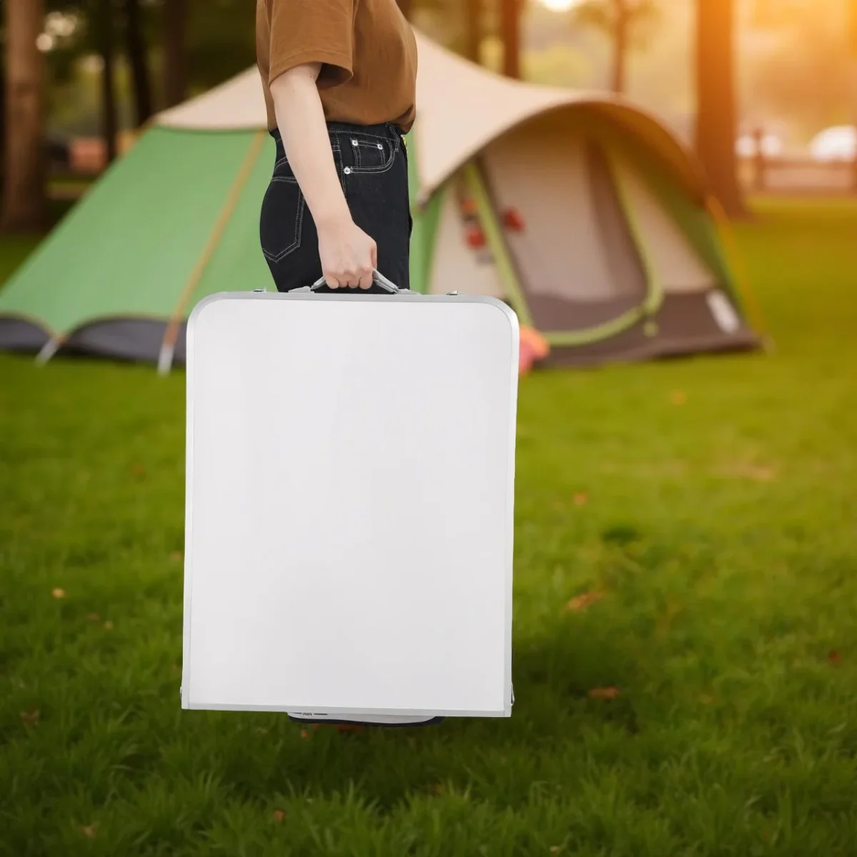 La Table pliable – Rangement™ se déploie littéralement en quelques secondes, sans aucun outil. Sa structure en X brevetée offre une stabilité immédiate sur tous types de terrains. Avec seulement 7 cm d’épaisseur une fois pliée, elle se glisse facilement dans votre coffre ou votre placard, même dans les espaces les plus restreints. Sa poignée intégrée rend son transport aussi simple qu’une valise légère.