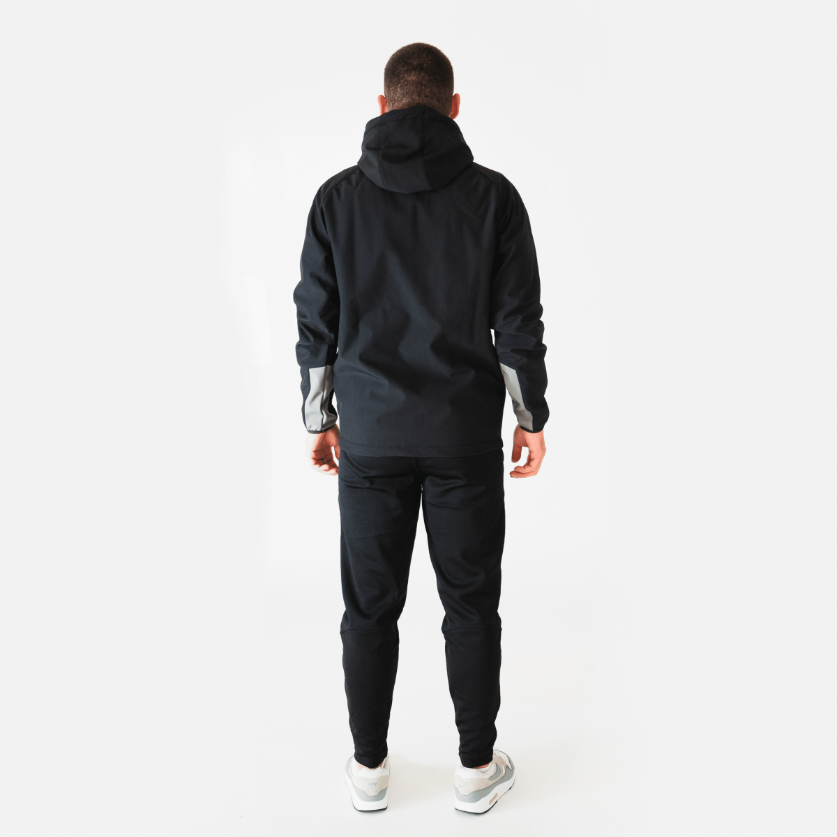Veste softshell à capuche, 3 couches avec 3 poches extérieur + 1 intérieur, coupe ajustée, finition élastique.