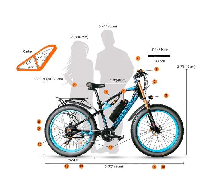 | Dimension du vélo | Hauteur 33,5″-41,3″ (85-105 cm) / Longueur 76″ (193 cm) |