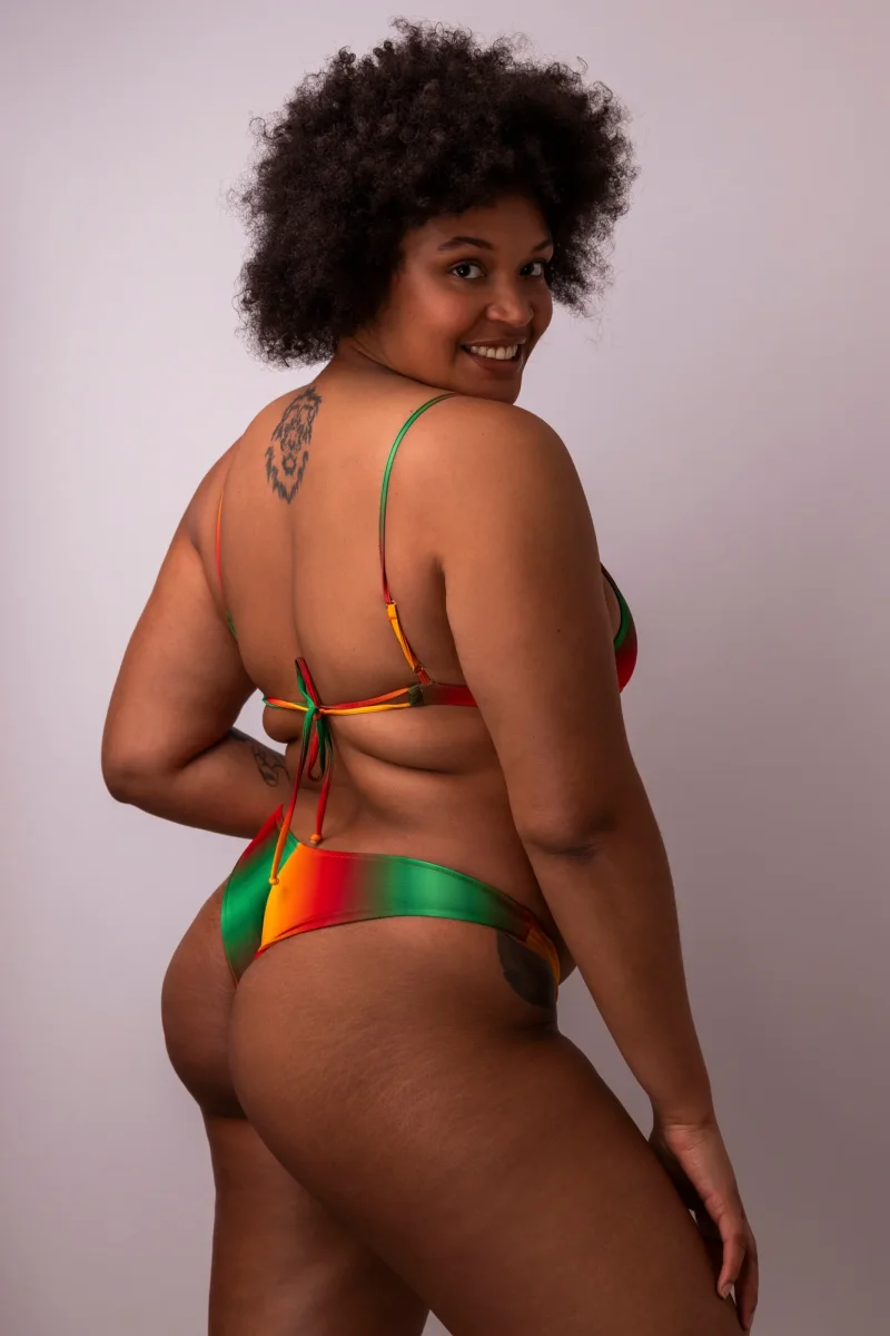 Inspiré par les couleurs vibrantes de la culture jamaïcaine, ce haut de maillot de bain présente un dégradé subtil allant du vert émeraude au jaune en passant par le rouge, évoquant l’esprit ensoleillé et festif de l’île.